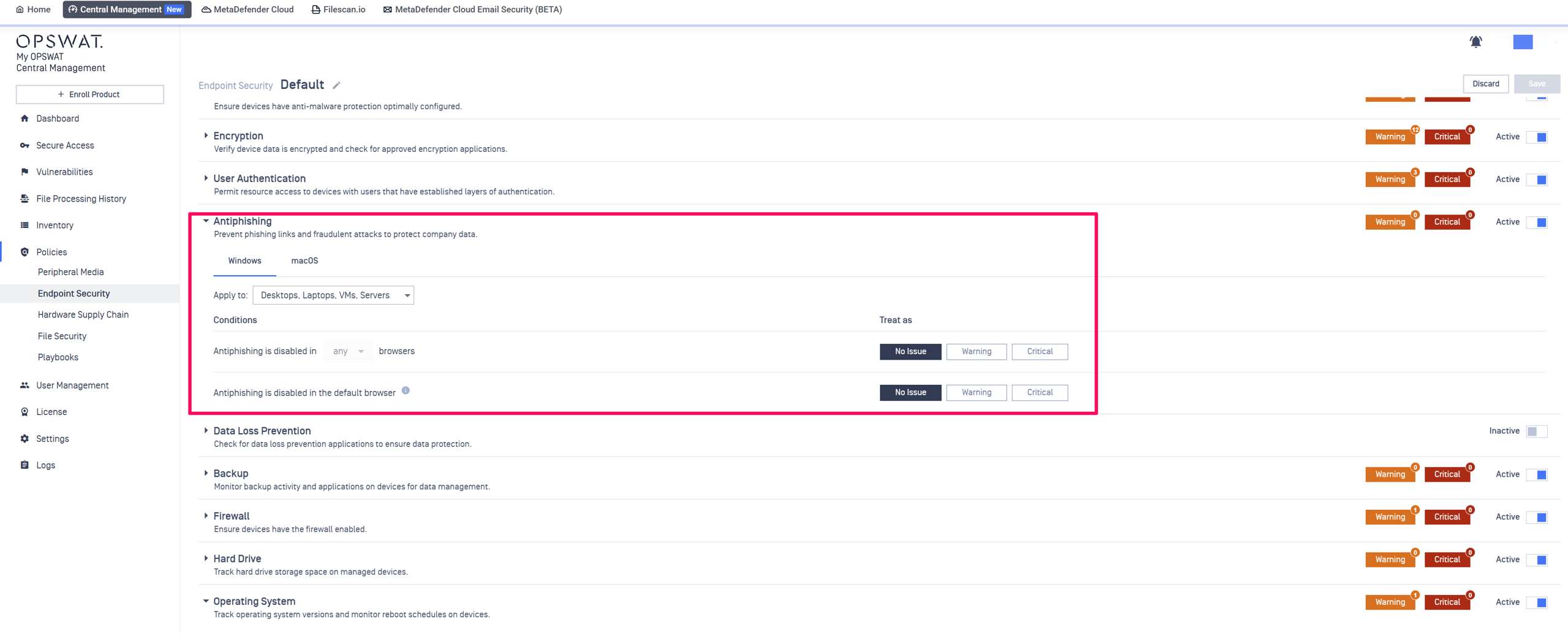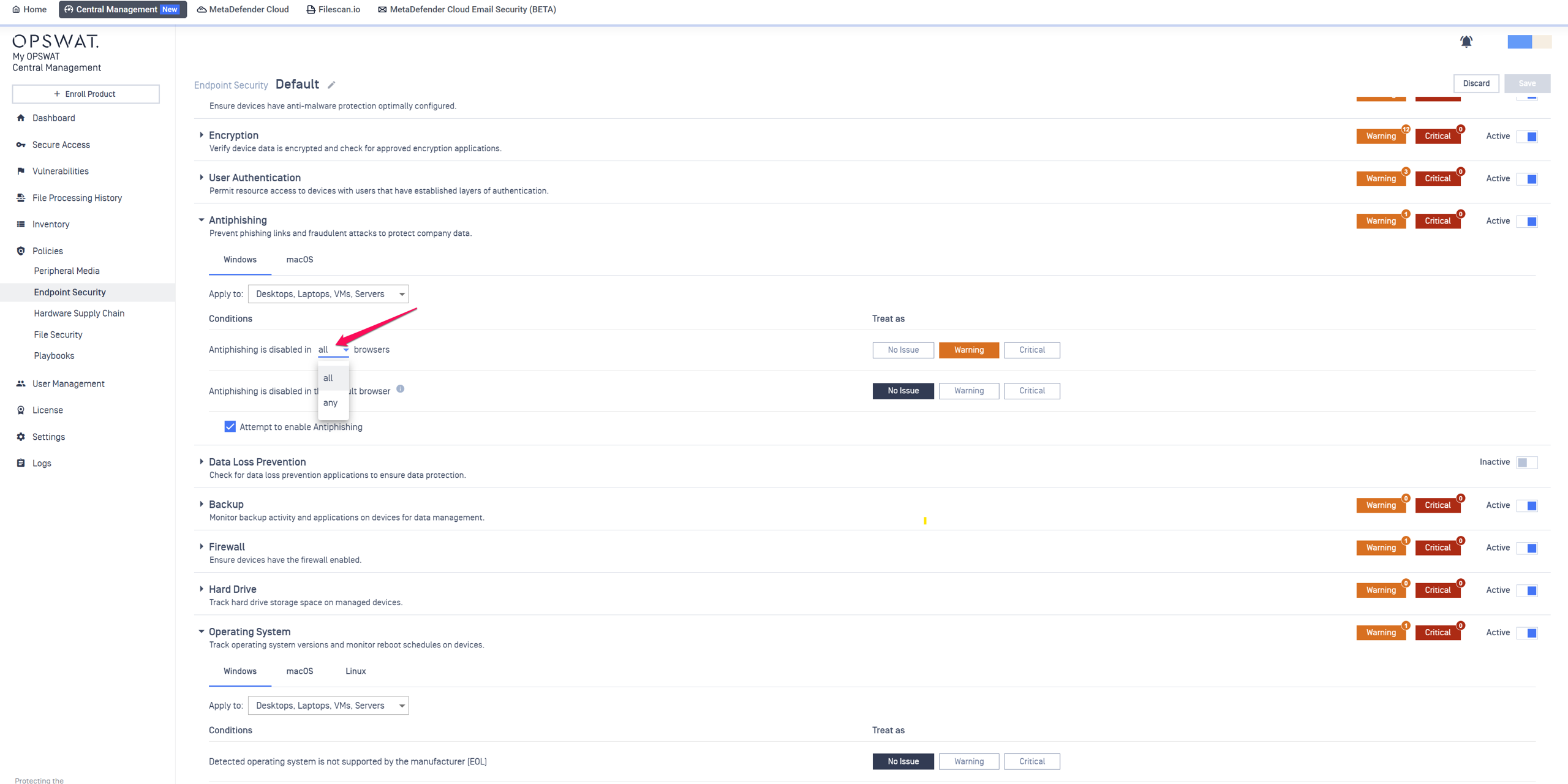 The Default Browser setting in your My OPSWAT Central Management Console under Policy Management>Policies>Relevant Policy>Relevant Device Tab>Deep Compliance>Anti-Phishing, as illustrated below, is applicable to all MetaDefender Endpoint versions and releases.