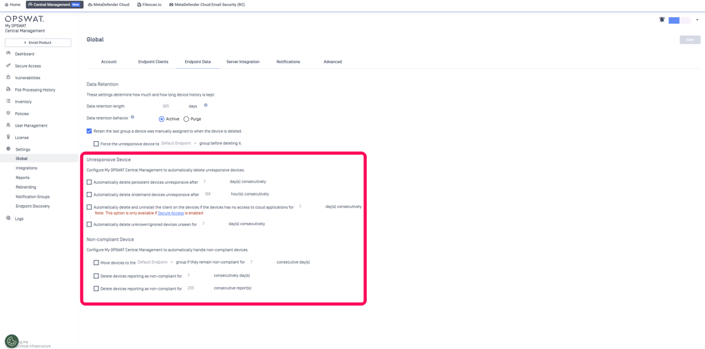 Each of these actions (remote Client uninstall and device removal, under various conditions) are independently configurable via My OPSWAT Central Management Console>Settings>Global> Endpoint Data, as illustrated below.