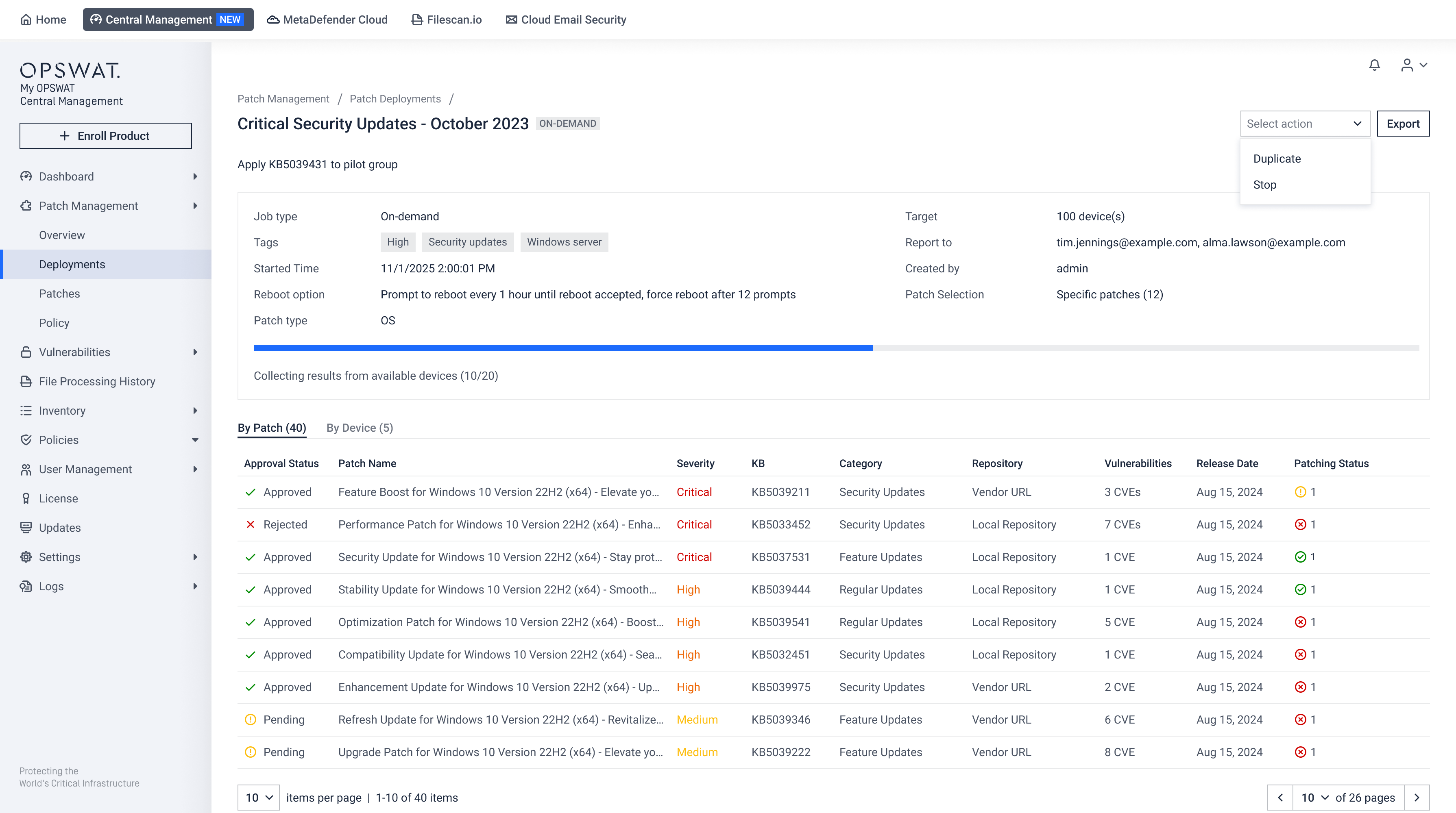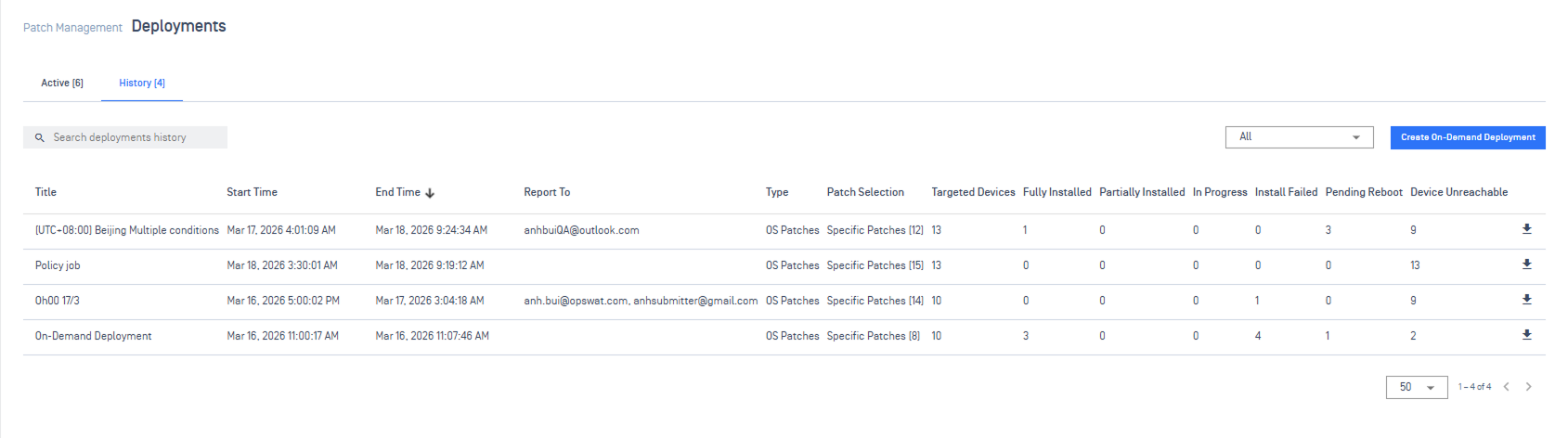- Incompleted: Patching job has been initiated on targeted device, but the device did not report its final execution results back to My OPSWAT Central Management.