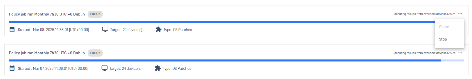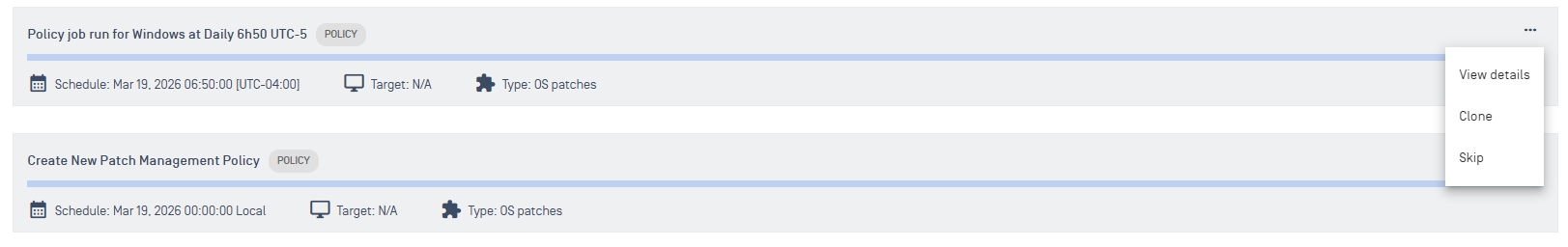 - Supported Actions: Select View Details for full policy breakdown; Clone to duplicate the deployment; or Skip to bypass the next scheduled occurrence without affecting the overall policy schedule.