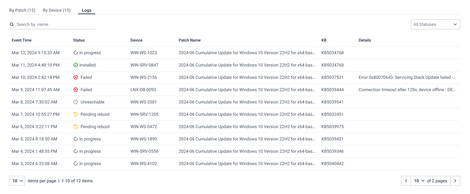 Click on the Logs tab for a granular, timestamped record of every patch installation attempt.