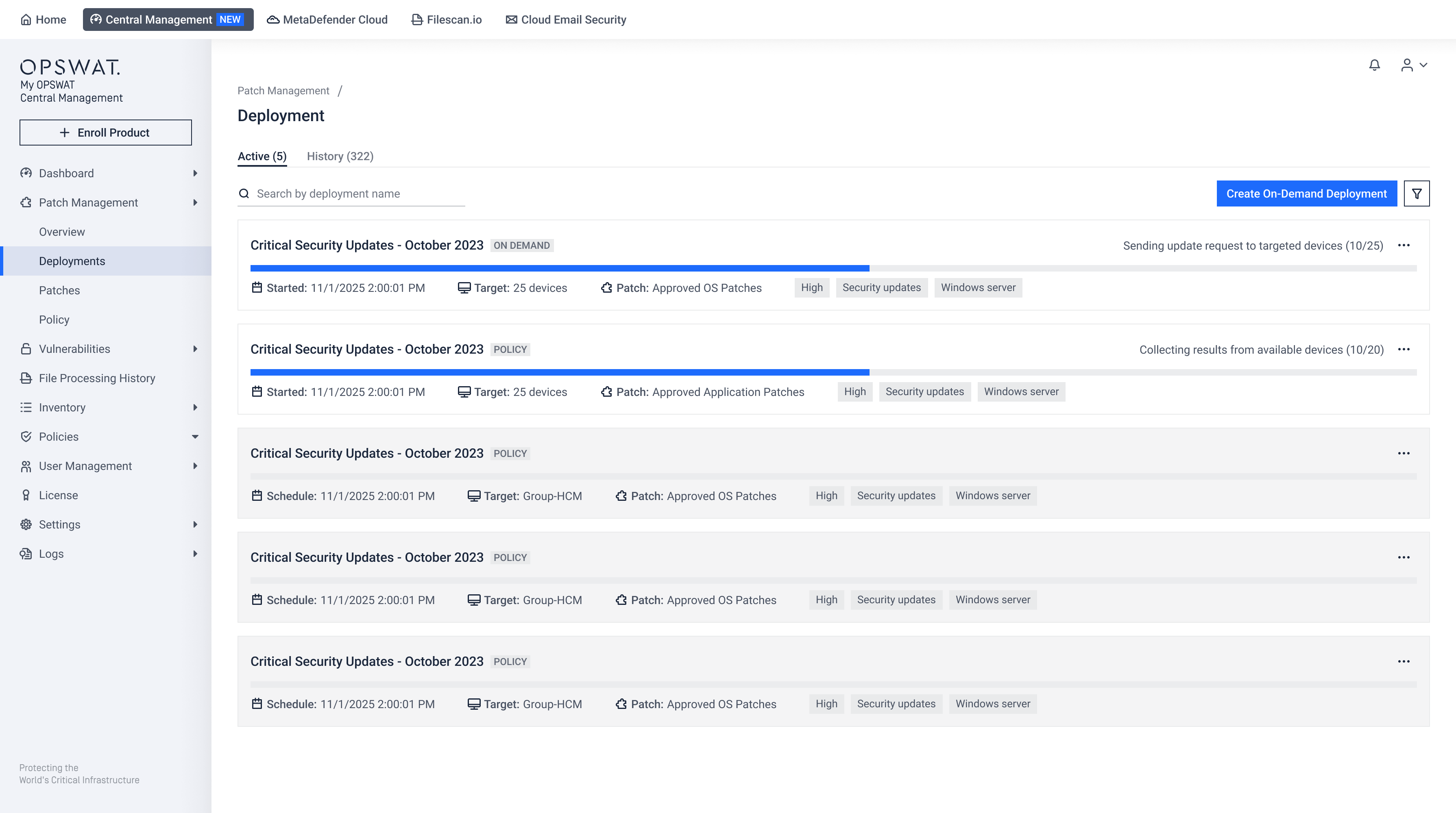 Deployments provides a central hub for overseeing the end-to-end patching process, monitoring real-time progress, and managing results for active and historical deployment from a single interface.