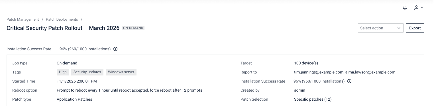 - Quick scan on critical information such as Job type, Tags, Start time, Reboot option, Patch type, Target, Report to, Created by, Patch selection.