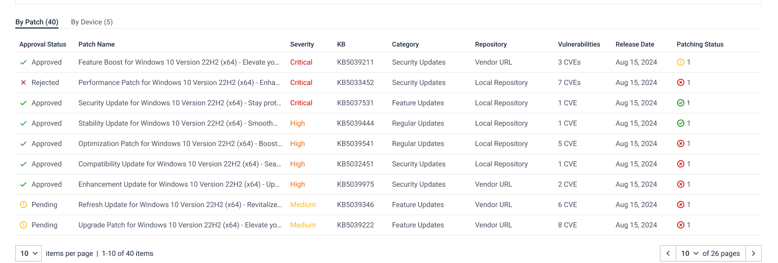 - Quick scan on Approval status, Patch name, Severity, Category, KB ID, Repository, Number of vulnerabilities, and Release date.