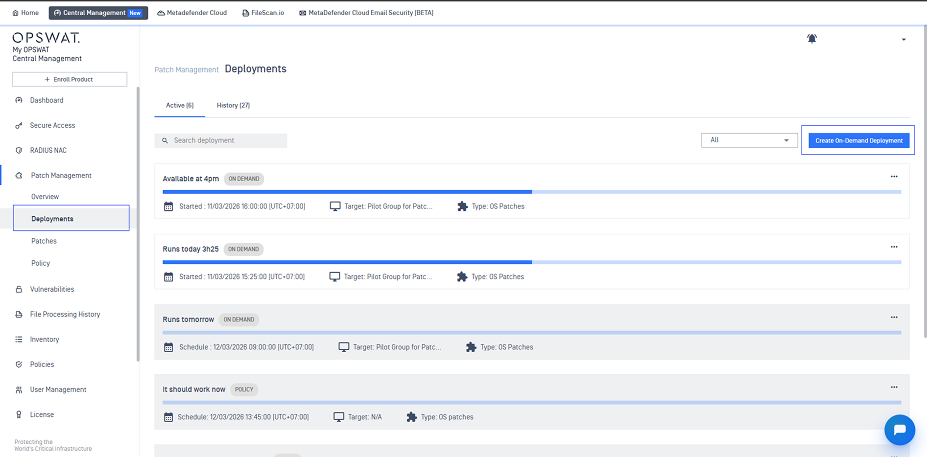 On-demand deployment is intended for immediate rollout of specific patches. Use it for urgent security fixes, critical bugs, or targeted updates without waiting for scheduled runs.