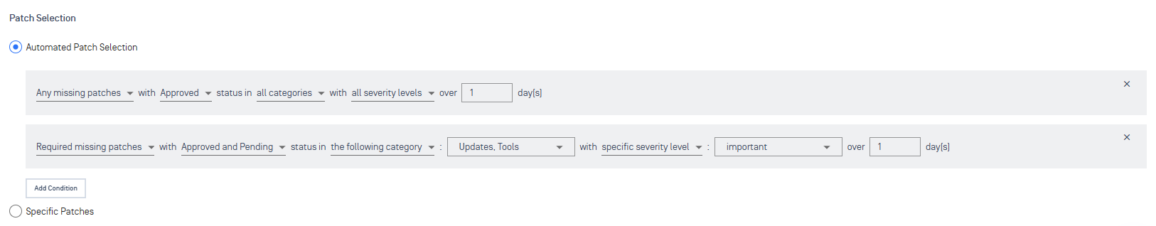 • Automated Patch Selection: Includes patches that match your criteria (e.g., "critical severity"). If you set multiple conditions, a patch only needs to match one to be included.