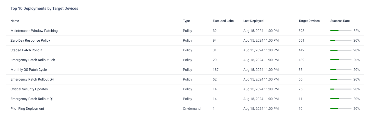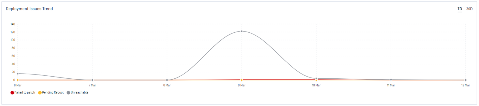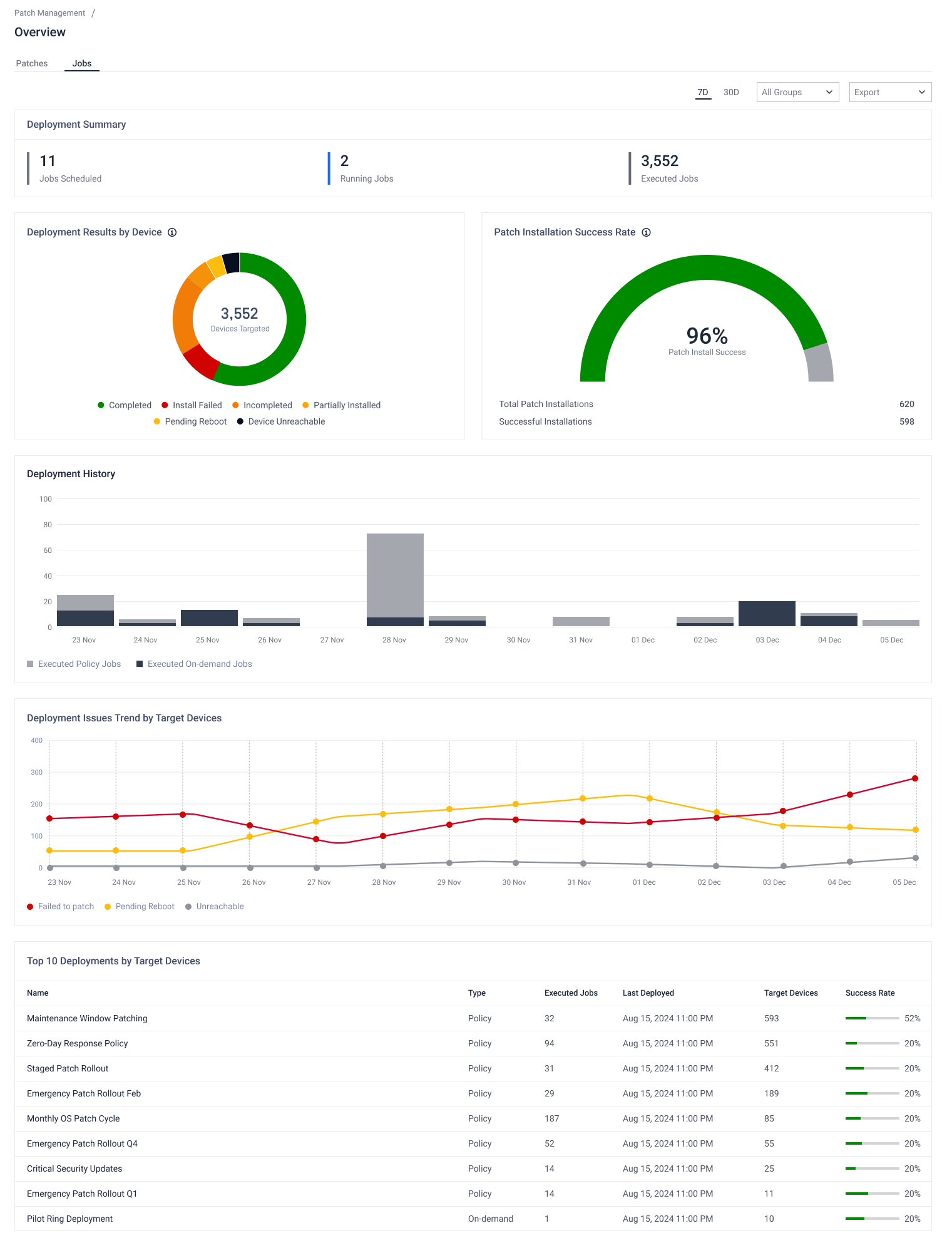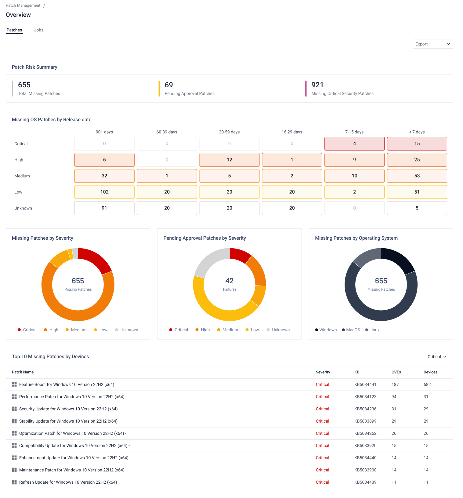 Patch Dashboard offers a centralized, real-time overview of the organization's patching status. It visualizes key insights on patches and deployments, prioritizing high-risk vulnerabilities for faster remediation.