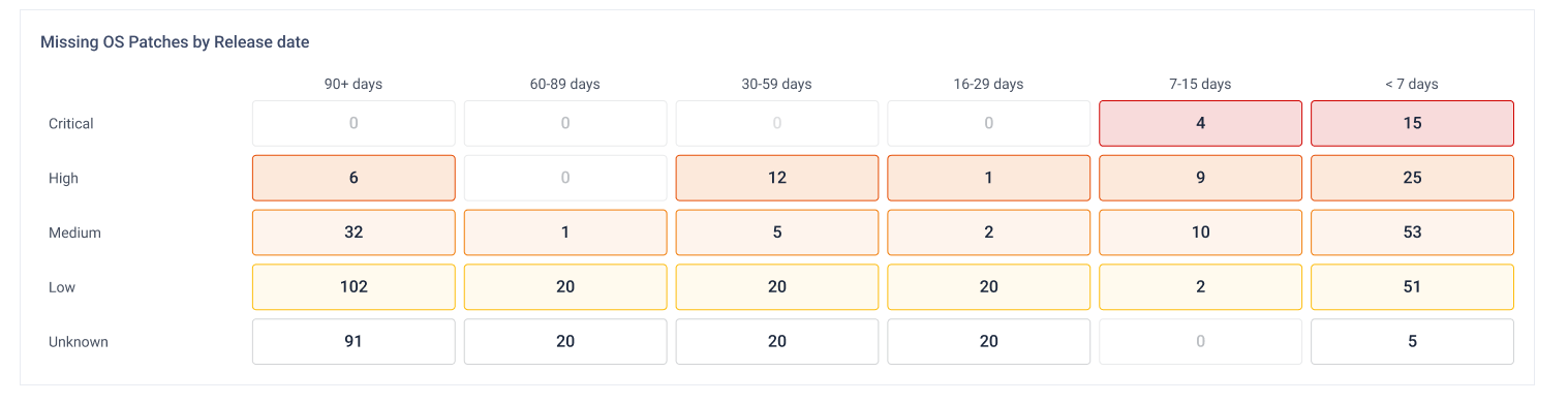 Organizes missing updates by their age and severity level. This visualization identifies long-standing vulnerabilities versus newly released threats, facilitating the targeted remediation of legacy risks.