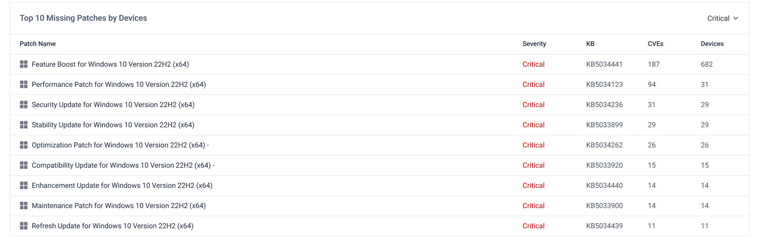 - Missing OS Patches by Severity: View the total volume of missing updates categorized by their risk level (Critical, High, Medium, or Low) for risk-based prioritization, ensuring the most critical vulnerabilities are addressed first.