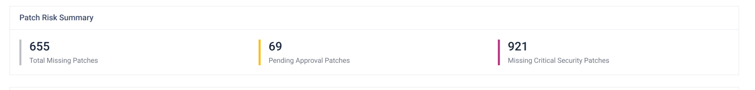 Provides an immediate snapshot of the organization’s vulnerability posture, summarizing total missing patches and current risk levels.