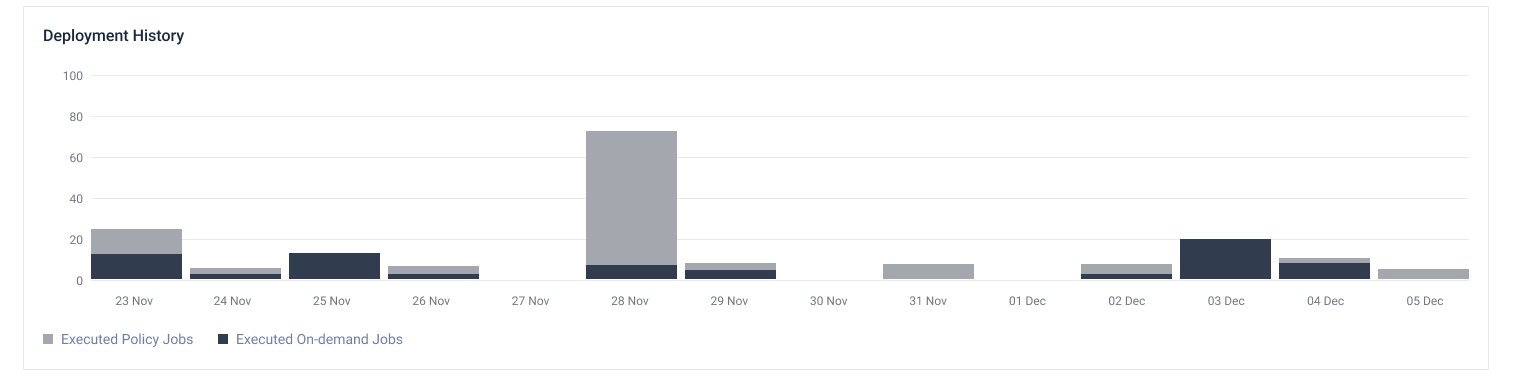 Tracks the daily volume of Policy and On-Demand deployment executions over time.