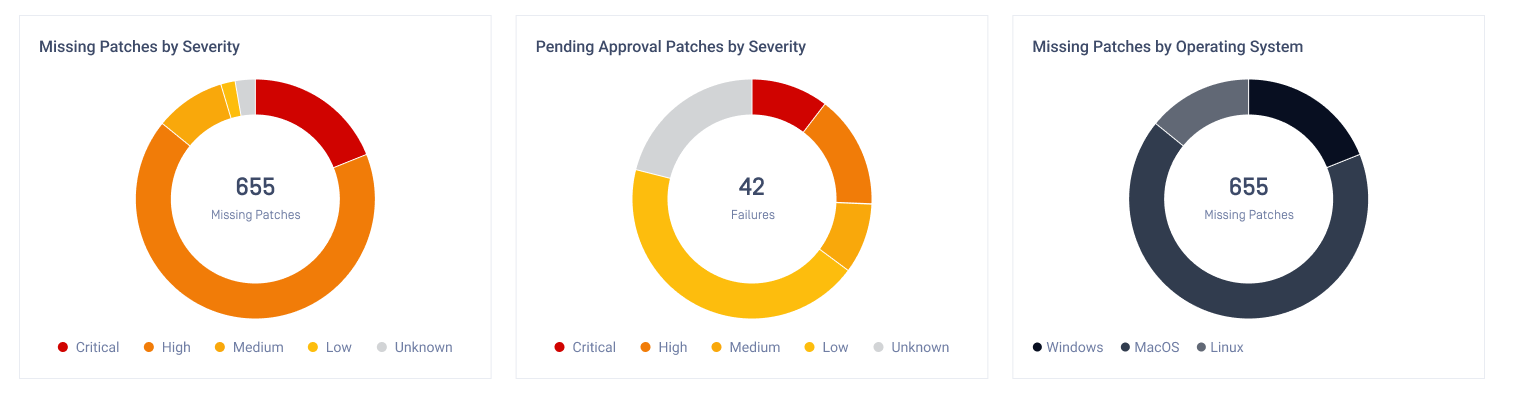 - Pending Approval by Severity: Identify patches that have been detected as missing but are not yet authorized for deployment. Monitoring this metric helps resolve bottlenecks in approval workflow before they lead to compliance gaps.