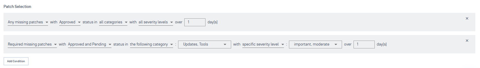 Only Automated Patch Selection is supported for policy deployment. Includes patches that match criteria (e.g., "critical severity"). If you set multiple criteria, a patch only needs to match one to be included.