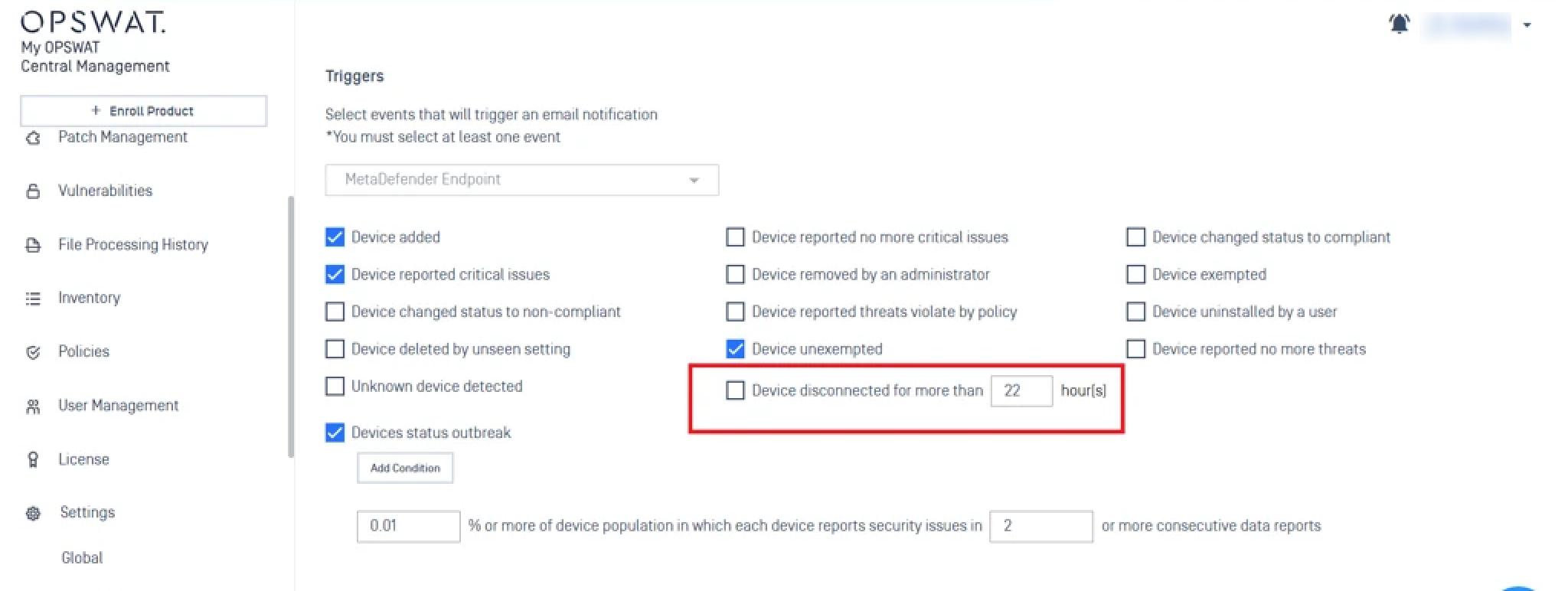 Introduced notifications when MetaDefender Endpoint becomes disconnected for a defined period, supporting timely incident response.