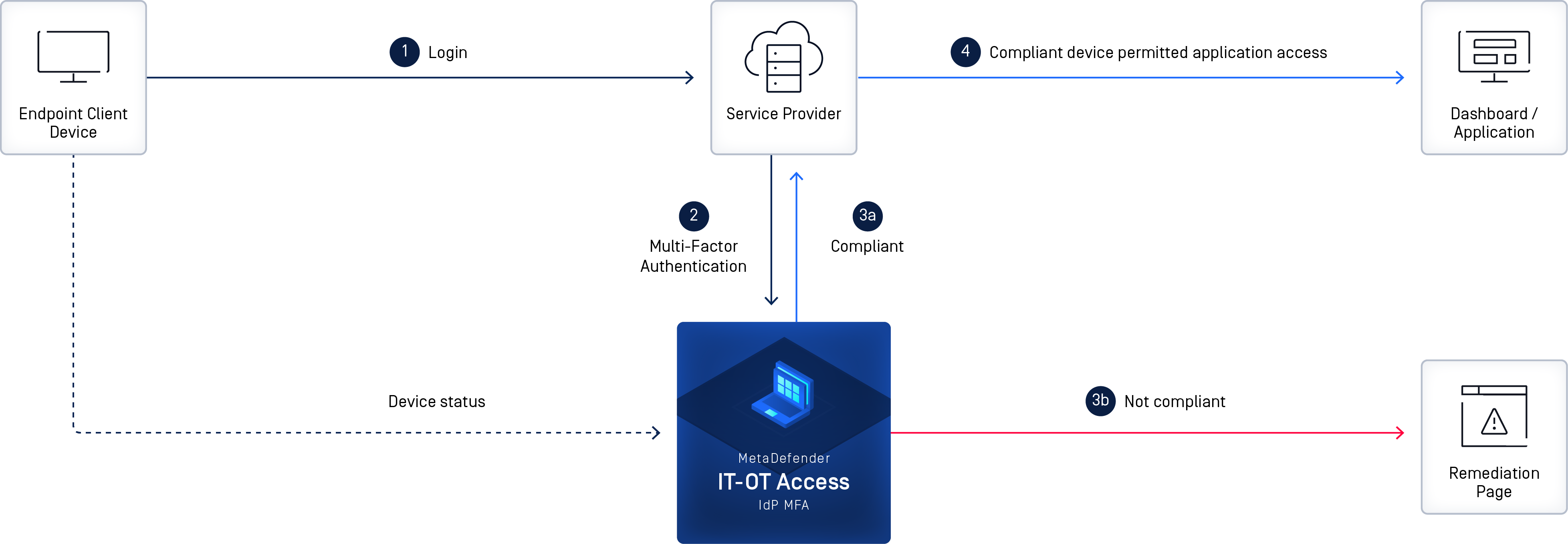 IdP MFA is a device compliance access control solution that leverages the Multi-Factor Authentication flow in Service Provided applications. Communication with your Service Provider is done with SAML, which returns a successful response for compliant devices that have the MetaDefender Endpoint installed.