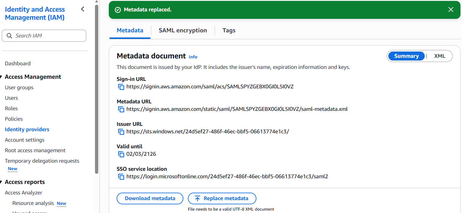 <ds:X509Certificate>and<X509Certificate>tags) with the one provided in step 5.1. You must update all certificate entries; otherwise, you will receive the error: "No valid roles associated with the account." - Replace metadata with the updated file