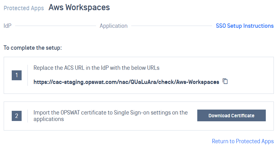 - After saving successfully, a SSO setup instruction will be shown, copy the ACS URL My OPSWAT Central Management generated there and download the OPSWAT Certificate. Note that this information can be found in the protected app's details later.