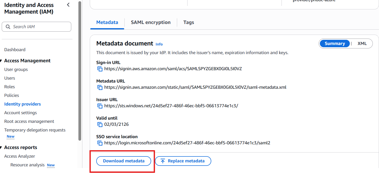 MIIDhDCCAmygAwIBAgIGAZO2xuJ7MA0GCSqGSIb3DQEBCwUAMIGCMS0wKwYDVQQDDCRjOTU5MDFlNi0xZTczLTQ3ZDMtOGE4YS03NzRmMDk5ZTQ5NzYxFDASBgNVBAsMC09wc3dhdCwgSW5jMRQwEgYDVQQKDAtPcHN3YXQsIEluYzELMAkGA1UEBwwCU0YxCzAJBgNVBAgMAkNBMQswCQYDVQQGEwJVUzAeFw0yNDEyMTExNzMxNDdaFw0zNDEyMTExNzMxNDdaMIGCMS0wKwYDVQQDDCRjOTU5MDFlNi0xZTczLTQ3ZDMtOGE4YS03NzRmMDk5ZTQ5NzYxFDASBgNVBAsMC09wc3dhdCwgSW5jMRQwEgYDVQQKDAtPcHN3YXQsIEluYzELMAkGA1UEBwwCU0YxCzAJBgNVBAgMAkNBMQswCQYDVQQGEwJVUzCCASIwDQYJKoZIhvcNAQEBBQADggEPADCCAQoCggEBANzFODN8VEvezs0K3NPaa33zd8rkIbP1SfI010HF9qEGsCZyxtDhiGKojMOkUspsNbuy1Je4aWVO8FFcXrp+Wf8bu1vRHi1gHUYn/Zhp1ktVJS/hEYxE4fs7UW770MYH2MN5GrUgqi3THOaG0UPg/8pkXxkjY6wc03EXMxdZUAT1t6wiIFTL+0OlwqoNLBPgVzSaVLmXawlrg+BDU5um/H8QcMyJVVTl1o+/VDwXKGpvK+1b8+8XyvDILogF8yM33uvcpqNxWr7bGOySJdQjwX+5tp2AUMpxL8avEpLu4p2WWV6K15vfBWdMSZExhmY6nJGX4z5FF/Fu27pLFBAPXLECAwEAATANBgkqhkiG9w0BAQsFAAOCAQEAK3oGjiuloDP5fo3/2XPf3g53cXpuRhMqg4jbxEtOsXsQ2byQKohNMnje3uPKJvAGiBFTDjt6DF2dEQ+pltZhwWMiGwUcAmTIEQRRczO+Doulbm/dOrSxhHdE7jiU54Zm0A4Nu+JV0GiHWGYsRTHzqXDuw/gfx3TU+OWkCwlQ2zs/D36pbV5C8Pqdk6VYDIyyXbT1ngX+1p+bVGsW9NRSArv92qUOSoCcifMa7HHmFRS5rEuXDFaJ+KPWS4V24vN7aoSd2kBaPfu7kP/LSDfo1awdUCJ+IPFAVWaPWzfPAj24iYy/HYcfwpHY0w1REoJcKqtbkzIBjy2uD2oAoUgJbA==- Login to your Aws Account. Navigate to IAM > Identity providers, then choose your Identity provider.