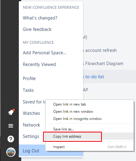 - Click on your avatar, right click on Log Out and choose Copy link address to get log out URL