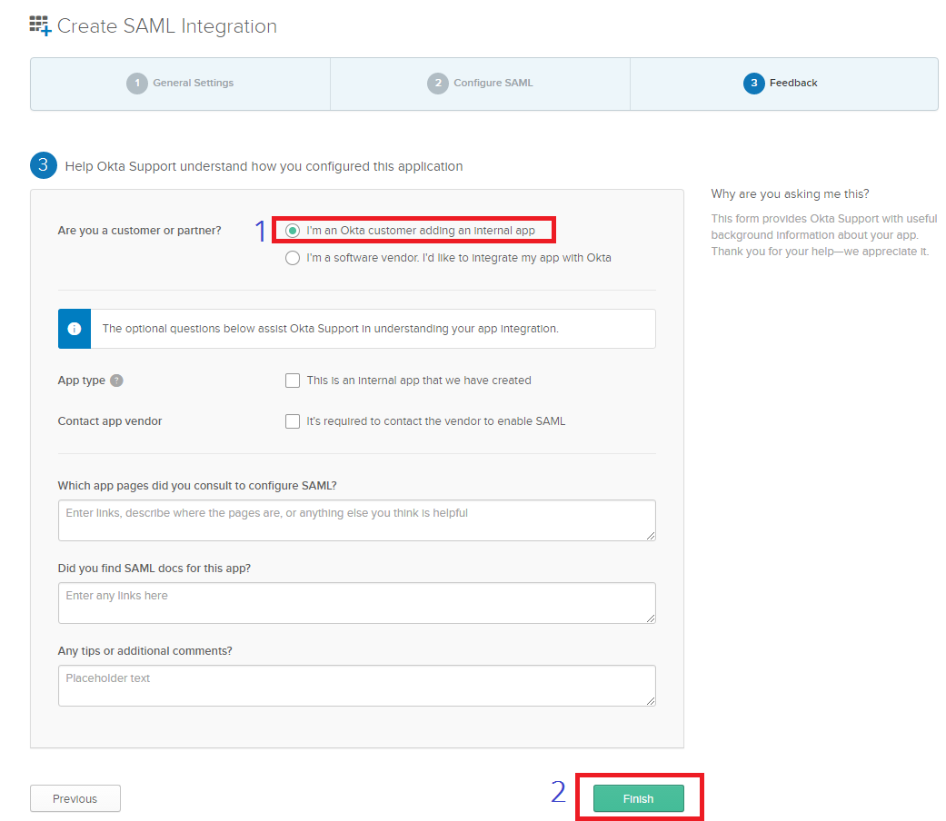 - On the step 3 Feedback, select the option "I'm an Okta customer adding an internal app" and click Finish