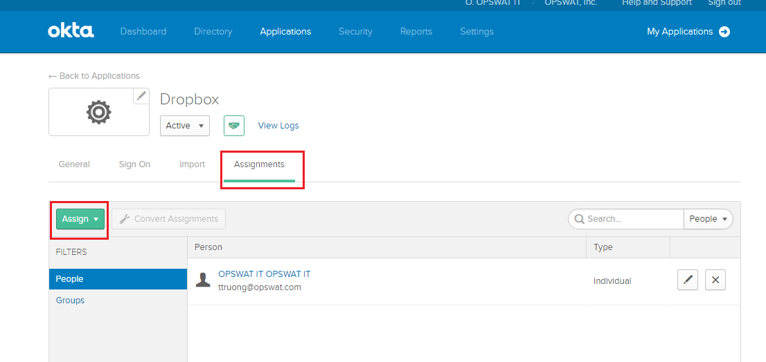 - On Assignments tab, click on Assign to assign person you want to allow to access this application