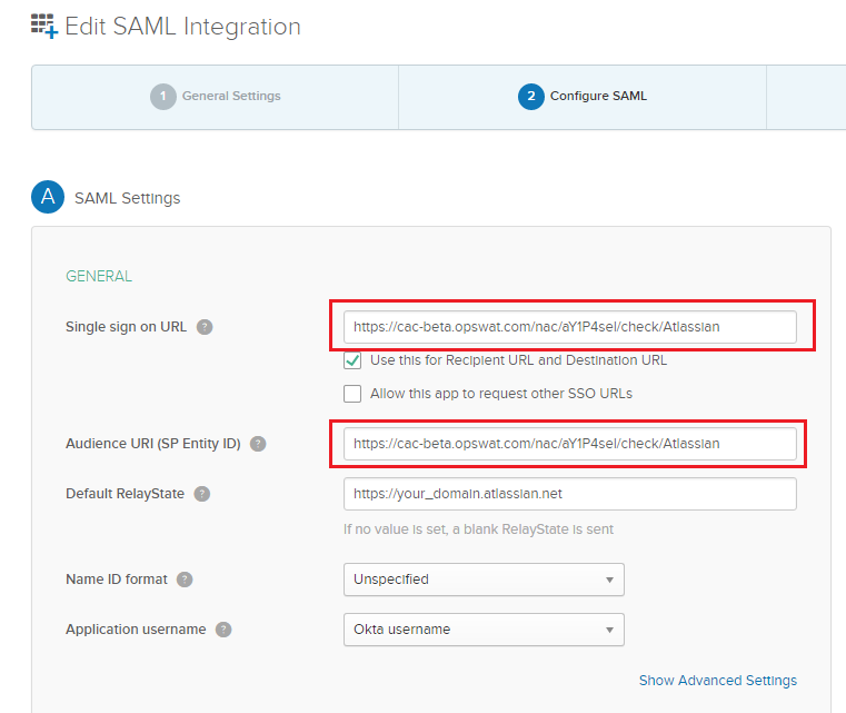 To get started with implementing My OPSWAT Central Management integration to enforce device posture check before granting a device to access Atlassian with Okta Single Sign On (SSO) service, you set up SSO between Okta and Atlassian manually as below steps even you already have SSO set up for Atlassian on Okta. The built-in Atlassian application doesn't allow you to modify a LoginURL of Atlassian.