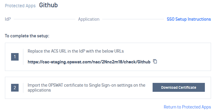 - After saving successfully, a SSO setup instruction will be shown, copy the ACS URL My OPSWAT Central Management generated there and download the OPSWAT Certificate. Note that this information can be found in the protected app's details later.