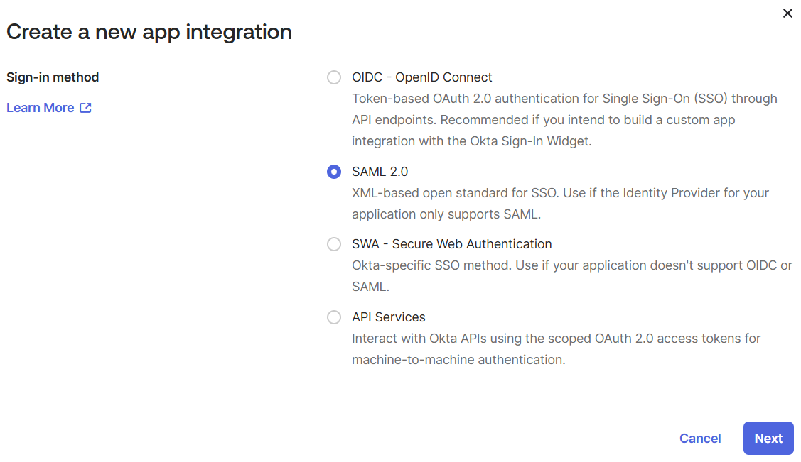 - Choose SAML 2.0 and click Next