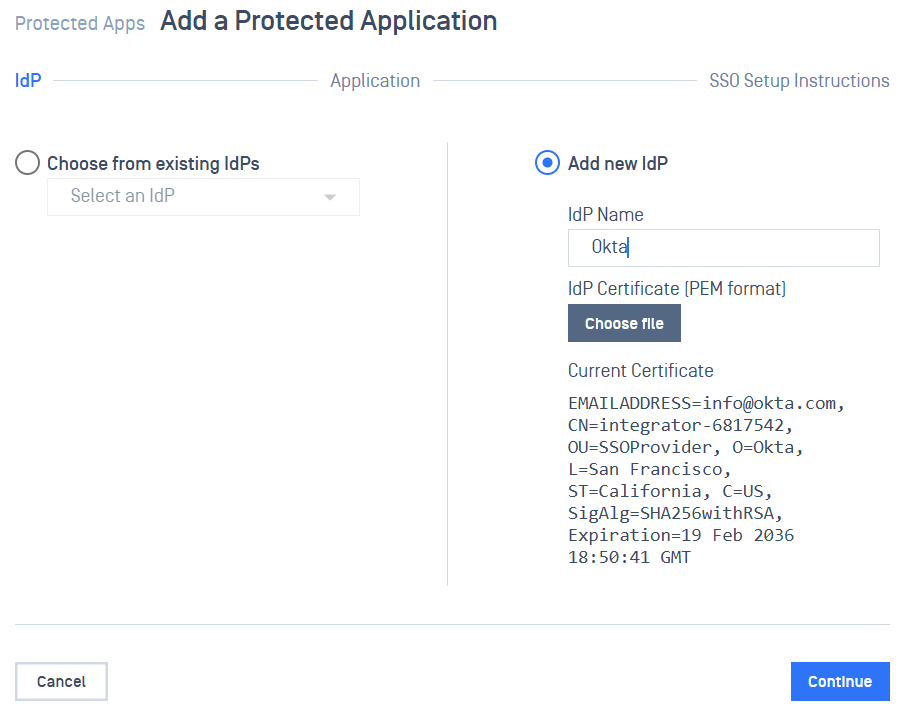 - Choose option Add new IDP , enter the name, and upload the certificate got in step 1.10. Then click Continue