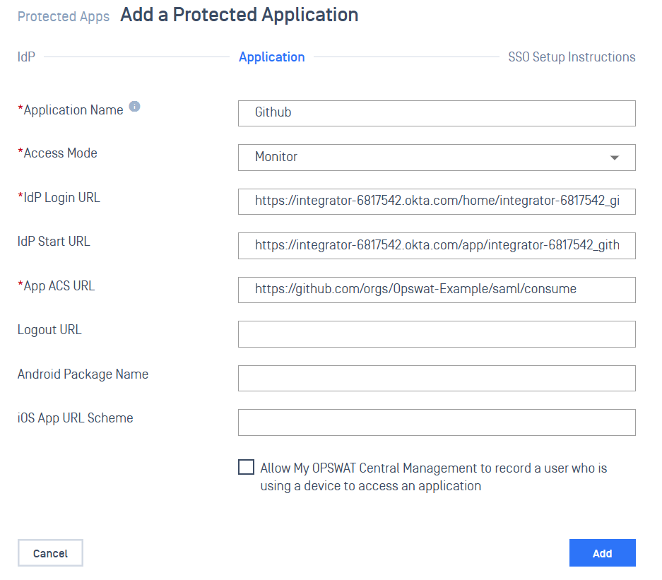 Follow below steps to integrate My OPSWAT Central Management with your Okta & Github.