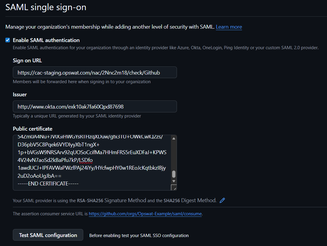- Click Test SAML Configuration. If the test is successful, click Save to complete the setup.