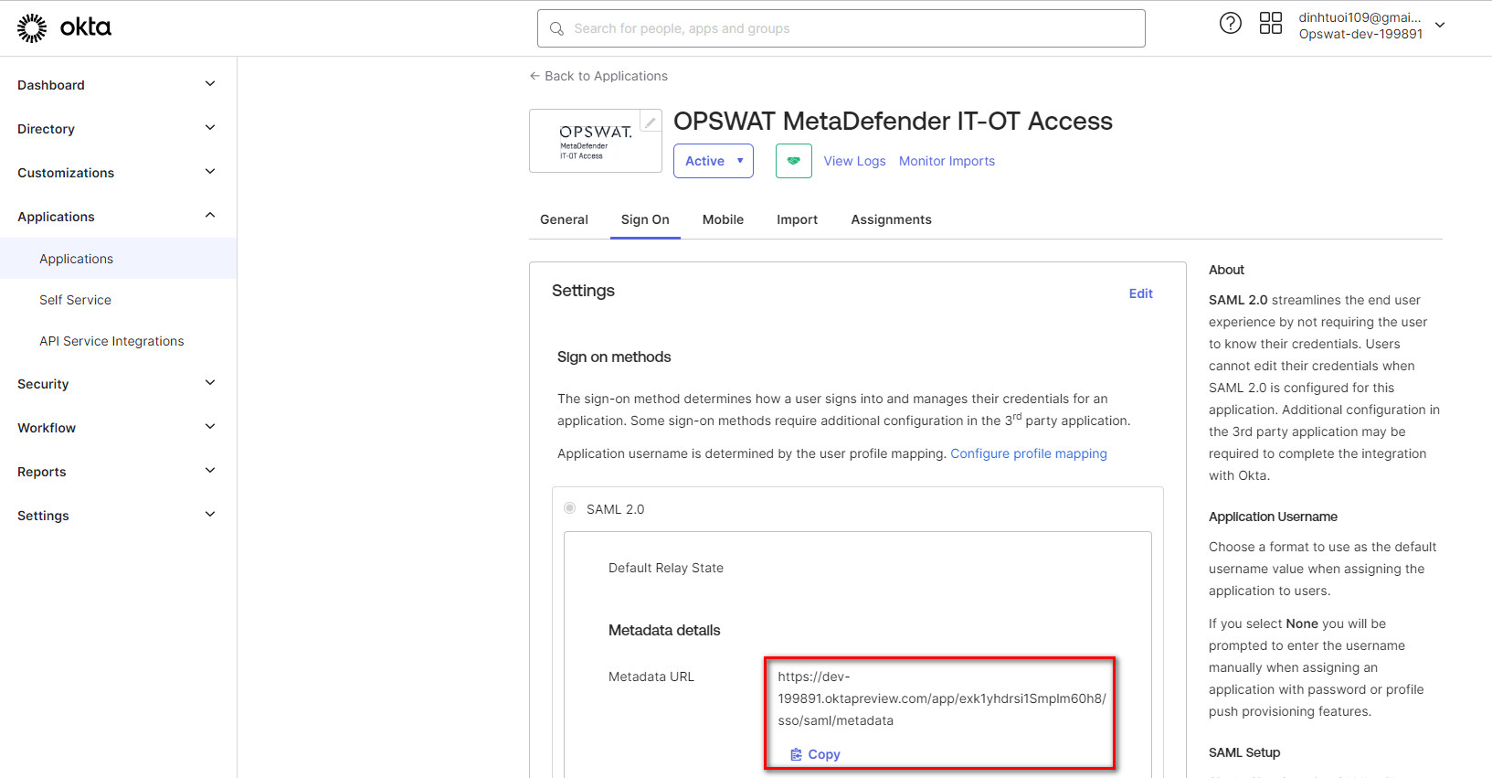 - On the next page (under the “Sign On” tab), in the Info Box labeled “SAML 2.0” there is a link called “Metadata URL”. Click Copy, open new tab and paste that url, press Enter. Save as metadata.xml file you will import into MetaDefender IT-OT Access.