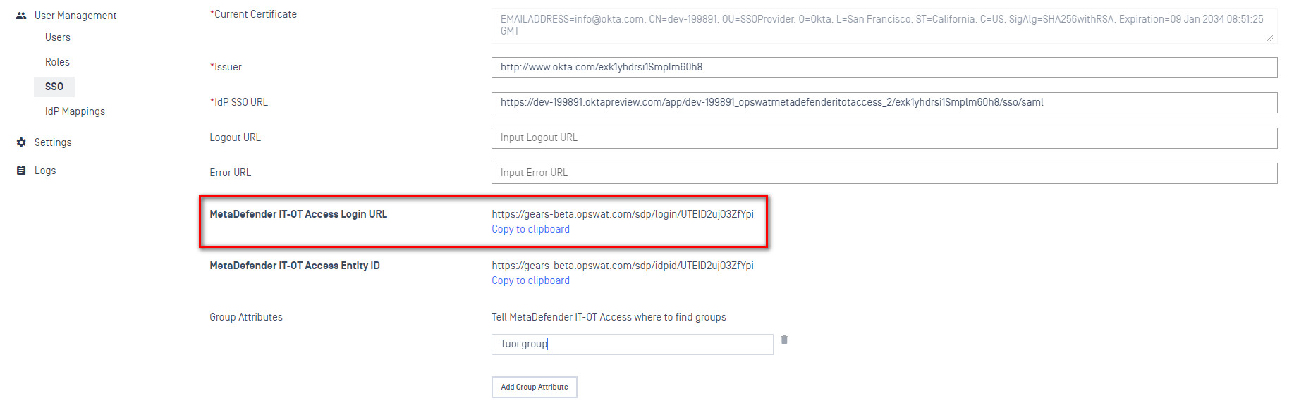 - There will be a placeholder URL under “Single sign on URL”. Replace this with the URL you just copied from MetaDefender IT-OT Access.