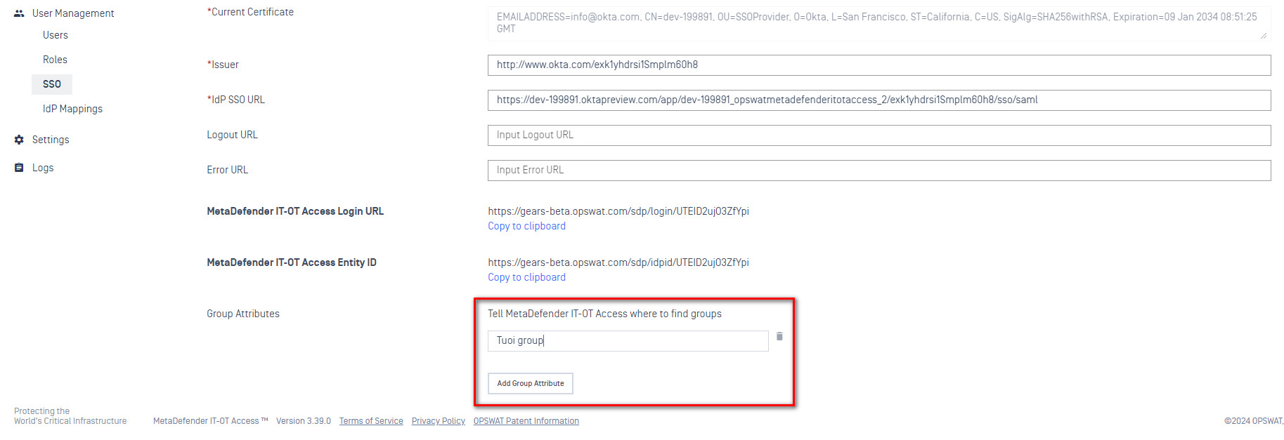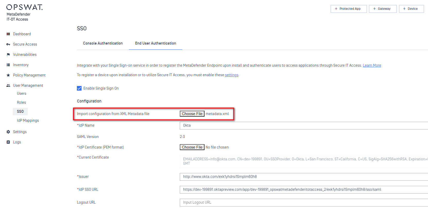 - In the “IdP Name” field, enter “Okta” or some other string. This is only for reference in the MetaDefender IT-OT Access UI.