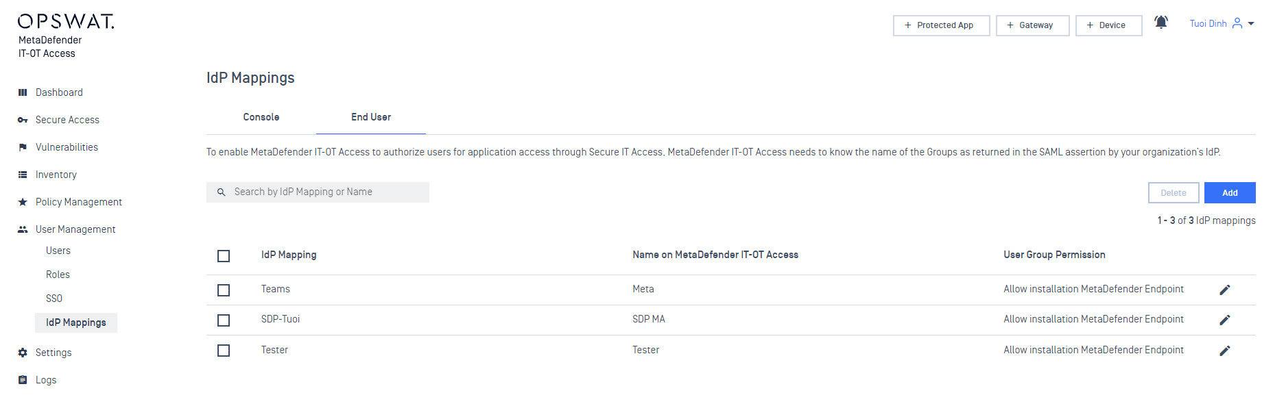 - Navigate to the MetaDefender IT-OT Access console at MetaDefender IT-OT Access, then go to User Management > IdP Groups, and click “Add”.