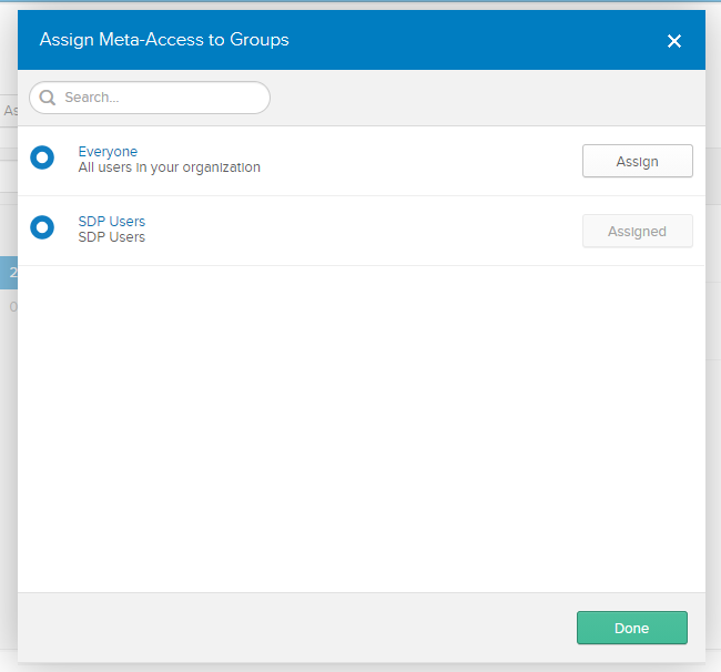- On the groups panel, you can decide which groups you want to use for assigning SDP access in the MetaDefender IT-OT Access console. Click “Assign” next to each SDP user group.