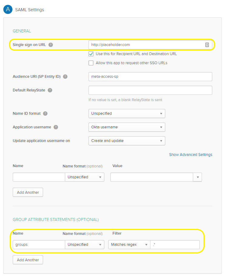 - Under the “SAML Settings” , fill in the “Single Sign on URL” field with a properly formatted URL as a placeholder.
