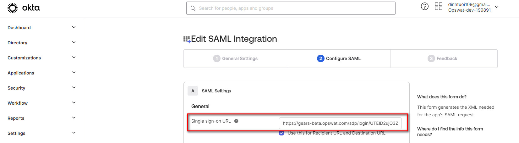 Note You will change this later after retrieving the applicable value from MetaDefender IT-OT Access. - Leave the box checked next to “Use this for Recipient URL and Destination URL”. Leave the box unchecked, next to “Allow this app to request other SSO URLs“.