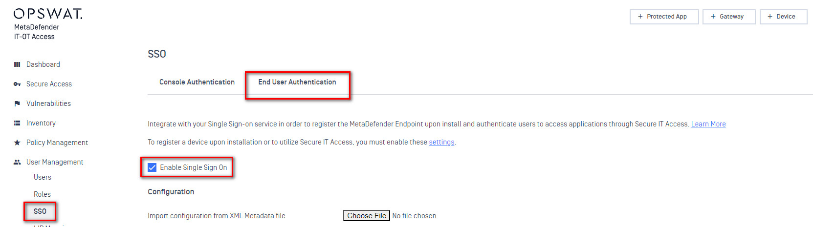 - Navigate to User Management > SSO > SDP and check “Enable Single Sign On”.