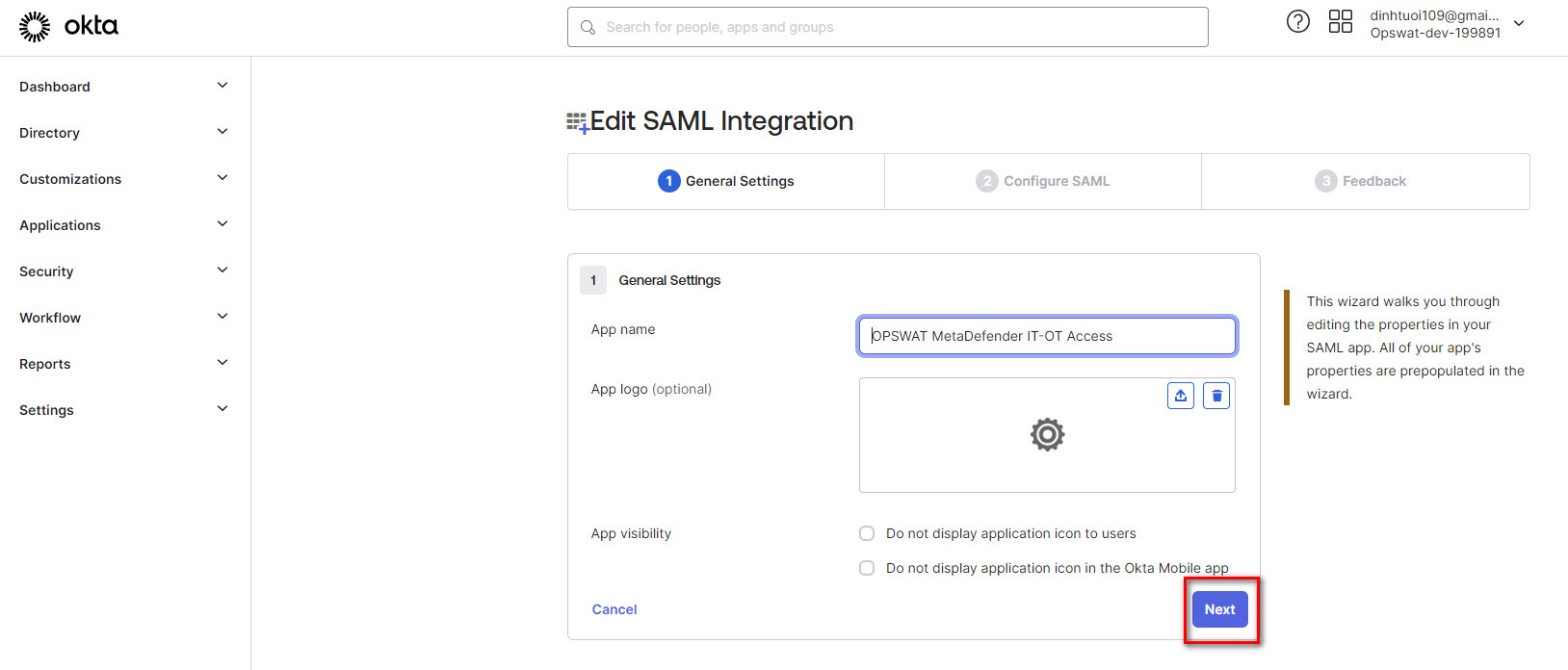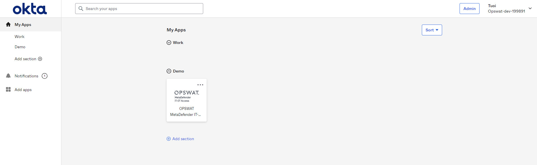 - Log back in to the Okta console as an end user and click on the “MetaDefender IT-OT Access” application.