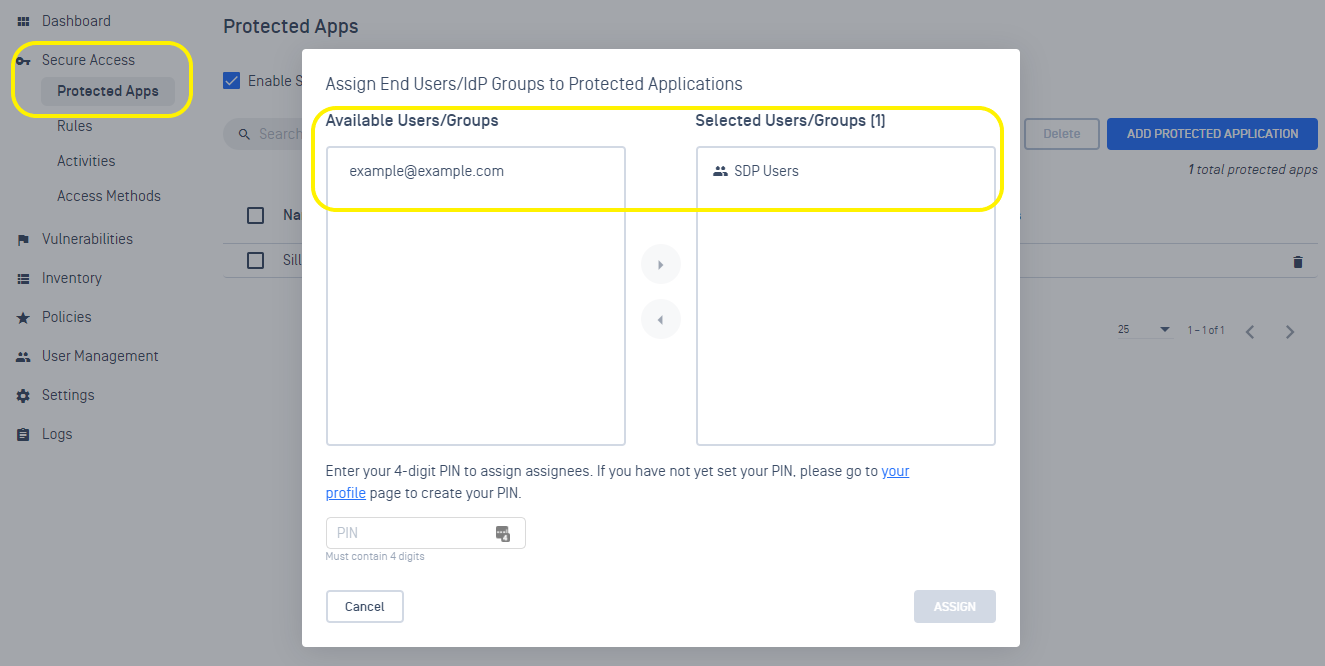 - On the “Assign End Users/IdP Groups to Protected Applications” Move groups “Available Users/Groups” to “Selected Users/Groups” to assign access, then enter your PIN again and choose Enter.
