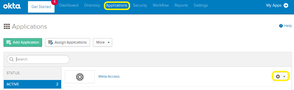 - In the navigation bar on the top, mouse over Applications and click the Applications link. Then click the Gear icon next to the MetaDefender IT-OT Access app, and choose “Assign to Groups”.