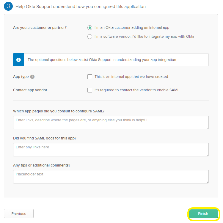 - The next page is just feedback for Okta, and has no functional impact. You can choose “I'm an Okta customer adding an internal app”, then leave all the other fields blank and click “Finish”.