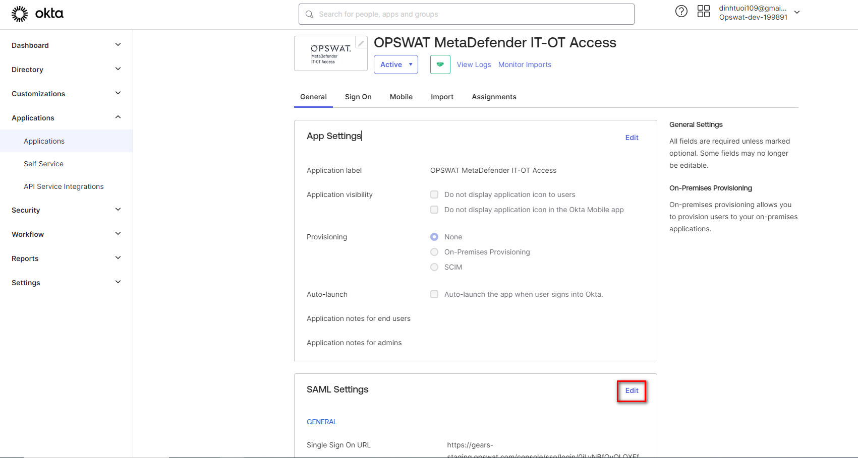 - Switch back to Okta, click the “General” tab, scroll down to “SAML Settings” and click “Edit”.