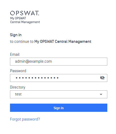 - Log in to the My OPSWAT Central Management console with administrative privileges.