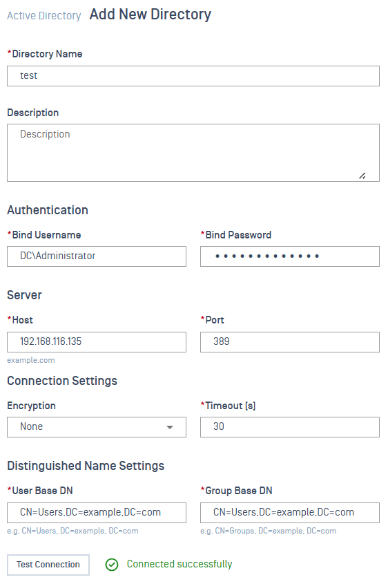 - Enter your Active Directory (AD) information, then click Test Connection to verify that the configuration is valid