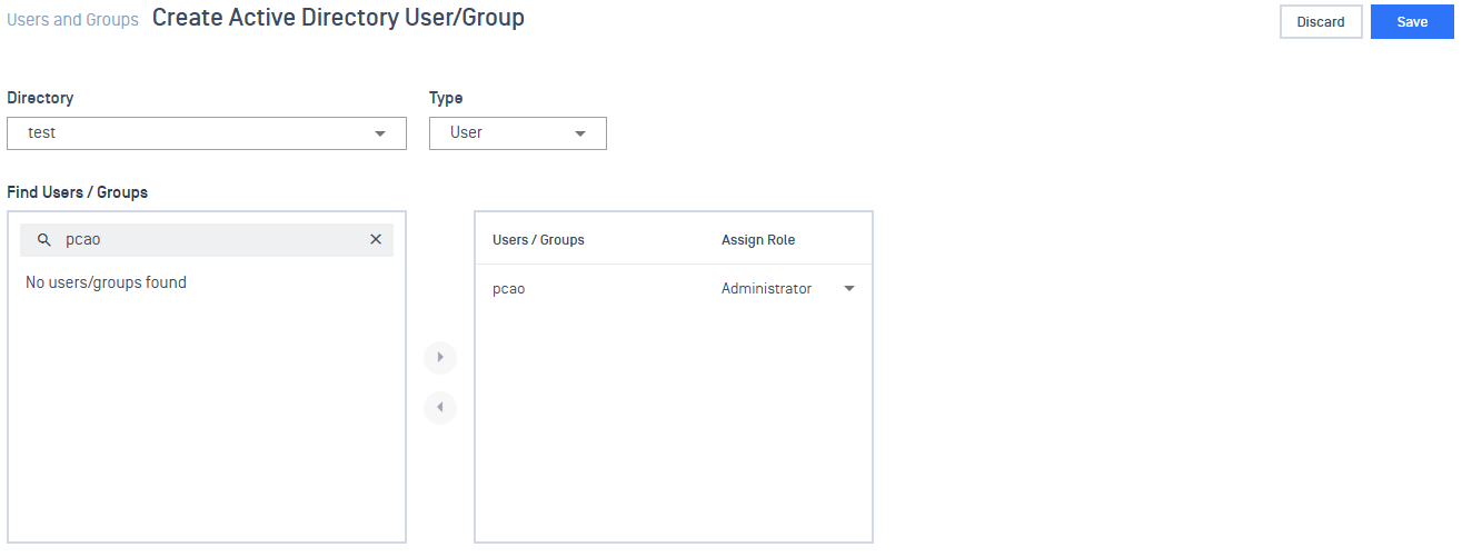 - To add users, select the directory and choose User as the type. Then, search for users within the directory and add them to the right-hand box.