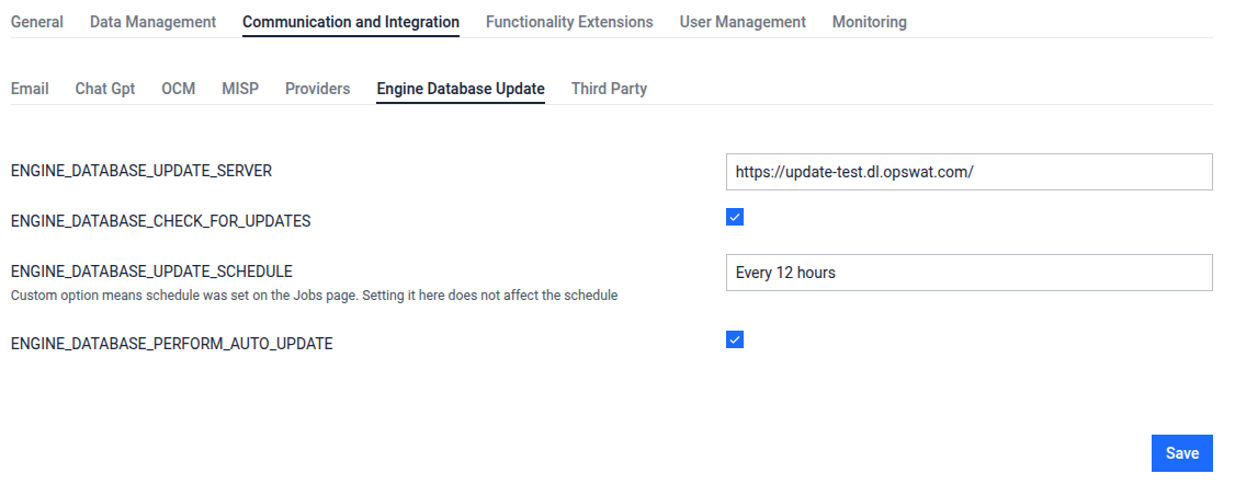 Admin Panel > Settings > Configuration > Communication and Integration > Engine Database Update