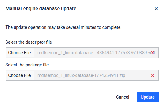 For environments with no internet access, use the MetaDefender Update Downloader tool to obtain the package, then upload it manually.