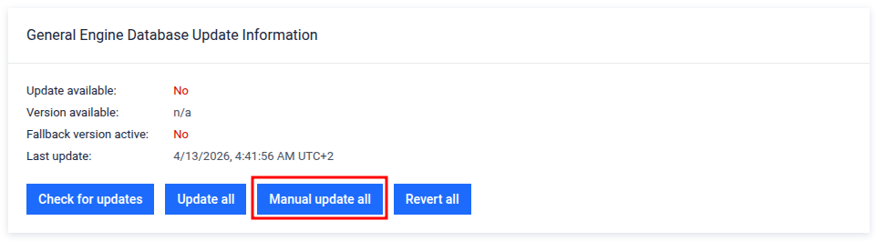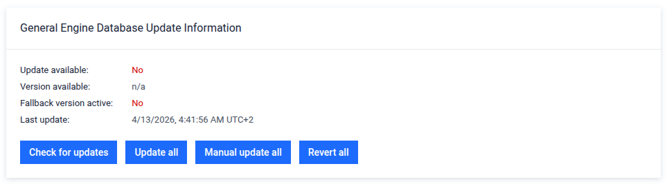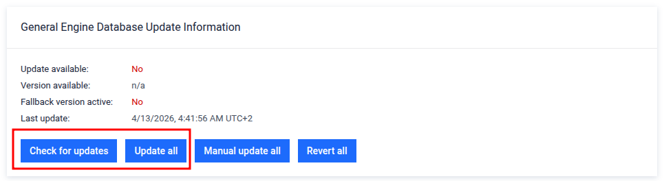 Go to Admin Panel > Settings > Integration > Engine Database Update to see the current database package status.